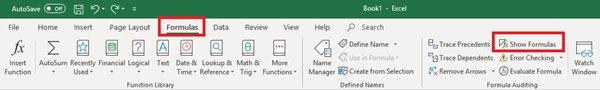 Jeśli „Pokaż formuły" na karcie Formuły jest włączony, formuły nie działają. Może to zrobić przypadkowo użytkownik lub ktoś, kto wcześniej korzystał z tego skoroszytu. Ten przycisk jest używany głównie podczas sprawdzania formuł. Dlatego wyświetla formułę zamiast wyniku końcowego. Jednak ta zakładka jest użyteczna podczas rozwiązywania problemów z błędami formuł.