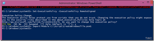 Teraz ponownie uruchom polecenie cmdletModuł importu<Script Path> at the prompt to import CreateWindowsTile.psm1 and you won’t get any error.