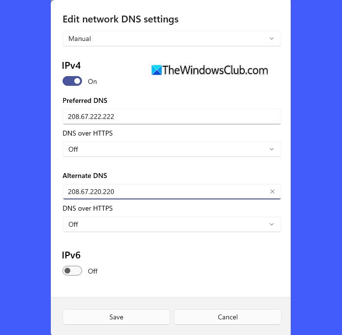 Następnie wybierzPodręcznikw menu poniżejEdytuj ustawienia DNS sieciwyskakujące okienko. Włącz IPv4 i wpisz adresy OpenDNS (wymienione poniżej) w poluPreferowany DNSIAlternatywny DNSpola: