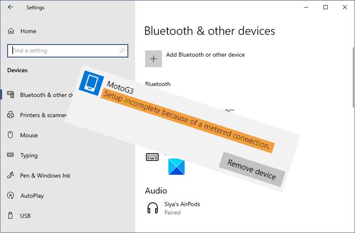 Niektórzy użytkownicy systemu Windows 11/10 napotykają błąd podczas próby, widzą „Konfiguracja nie została ukończona z powodu połączenia taryfowego„.Z tego powodu nie będzie można korzystać z urządzenia Bluetooth. W tym artykule naprawimy błąd.