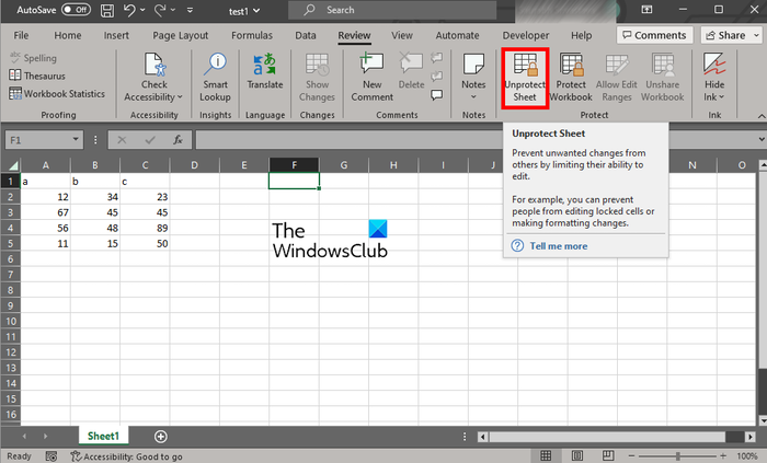 Możesz usunąć ochronę hasłem z arkusza programu Excel z poziomuRecenzjapatka. Przejdź do tej zakładki ze wstążki i następnie naciśnijUsuń ochronę arkuszaprzycisk. Możesz teraz wprowadzić poprawnyhasłoi naciśnijOKprzycisk, aby go odblokować. Sprawdź, czy narzędzie sprawdzania pisowni zaczęło już działać.