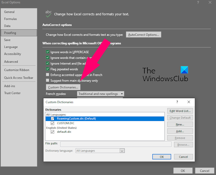Być może ten problem występuje, ponieważ w programie Excel nie włączono słowników niestandardowych. Dlatego jeśli scenariusz ma zastosowanie, możesz włączyć słowniki niestandardowe, a następnie sprawdzić, czy problem został rozwiązany.