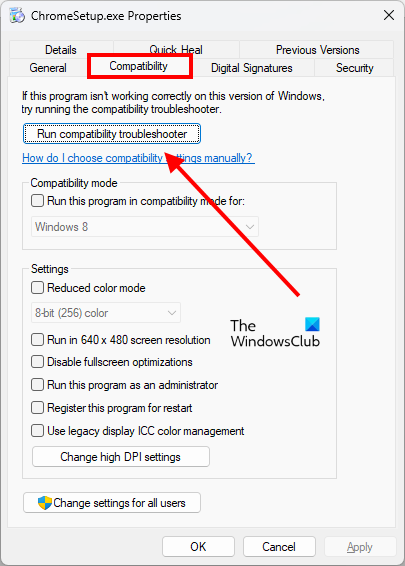 Jedynym sposobem uruchomienia programu, który nie jest obsługiwany przez system Windows 11 lub Windows 10, jest uruchomienie go w trybie zgodności. Kliknij prawym przyciskiem myszy skrót programu lub oprogramowania na pulpicie i wybierz Właściwości. W oknie Właściwości wybierz zakładkę Zgodność. Teraz zaznacz pole wyboru w sekcji Tryb zgodności i wybierz wcześniejszą wersję systemu operacyjnego, np. Windows 8. Kliknij Zastosuj, a następnie kliknij OK, aby zapisać zmiany.