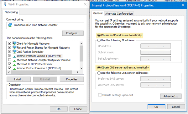 Aby potwierdzić, naciśnijWygraj + R, typncpa.cpli naciśnij przycisk Enter. Możesz znaleźć nazwę Ethernet lub dowolną inną podłączoną sieć. Kliknij go prawym przyciskiem myszy, wybierzWłaściwości>Protokół internetowy w wersji 4 (TCP/IPv4).Następnie kliknijWłaściwości. W kolejnym oknie sprawdź czyUzyskaj adres serwera DNS automatyczniejest wybrany, czy nie. Jeśli nie, musisz go wybrać wraz zUzyskaj adres IP automatycznie.
