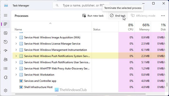 Aby rozwiązać problem wysokiego użycia pamięci lub procesora w usłudze użytkownika powiadomień wypychanych systemu Windows na komputerze, postępuj zgodnie z poniższymi instrukcjami: