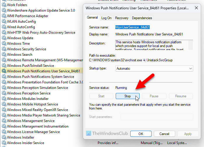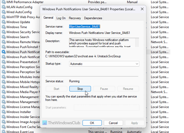 Usługa użytkownika powiadomień wypychanych systemu Windows przestała działać; musisz sprawdzićPowiadomieniaustawienie jako pierwsze. Możesz postępować zgodnie z tym przewodnikiemlub powiadomienia specyficzne dla aplikacji w systemie Windows 11/10. Następnie możesz sprawdzić, czy dana usługa jest uruchomiona, czy nie. W tym celu możesz skorzystać z wyżej wymienionego przewodnika. Jeśli status jest oznaczony jakoZatrzymany, musisz kliknąćStartprzycisk.