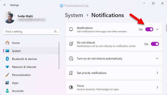 W tym celu naciśnijWygraj + ja, aby otworzyć panel Ustawienia systemu Windows i przejść doSystem > Powiadomienia.
