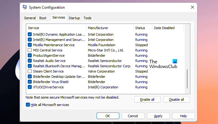 Po uruchomieniu system Windows ładuje wszystkie sterowniki, usługi Windows, aplikacje startowe i usługi innych firm. Wszystkie usługi i aplikacje startowe działają w tle. Twój system wymaga usług Windows. Dlatego wyłączenie usług systemu Windows nie jest właściwą decyzją, ponieważ może spowodować niestabilność systemu. Możesz jednak wyłączyć usługi stron trzecich. Nie spowoduje to żadnych błędów w systemie. Aby wyświetlić i wyłączyć usługi stron trzecich, musisz użyć.