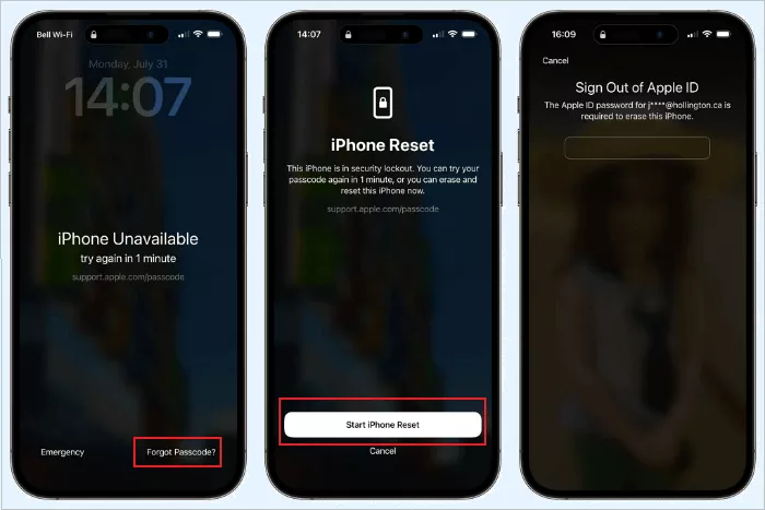 >Iniciar reinicialização do iPhonee digite a senha do seu ID Apple para sair da conta