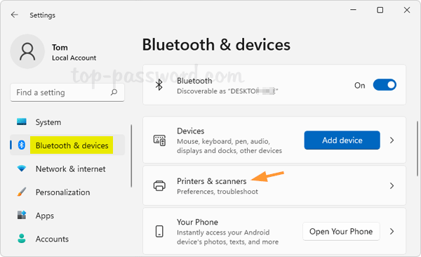 - Pressione a tecla Windows + I para iniciar o aplicativo Configurações e clique emBluetooth e dispositivoscategoria. No lado direito, clique emImpressoras e scanners.