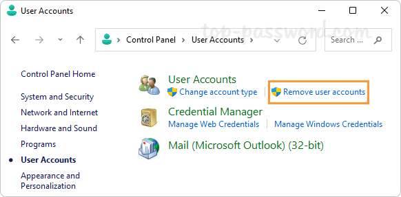- Clique em “Remover contas de usuário”Opção na seção “Contas de usuário”.