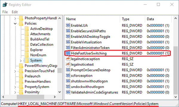 HKEY_LOCAL_MACHINE\SOFTWARE\Microsoft\Windows\CurrentVersion\Policies\System - No painel do lado direito, procure o valor denominadoHideFastUserSwitching. Se não existir, você pode criar um clicando com o botão direito no espaço vazio do painel direito e escolherNovo–>DWORD (32 bits)Valor.