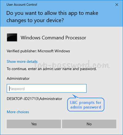 Observe que é impossível ignorar o prompt do UAC se você estiver conectado ao Windows com uma conta padrão. Quando a senha de administrador do UAC é perdida, você pode promover sua conta padrão como administrador ou redefinir sua senha esquecida com PCUnlocker Live CD/USB.