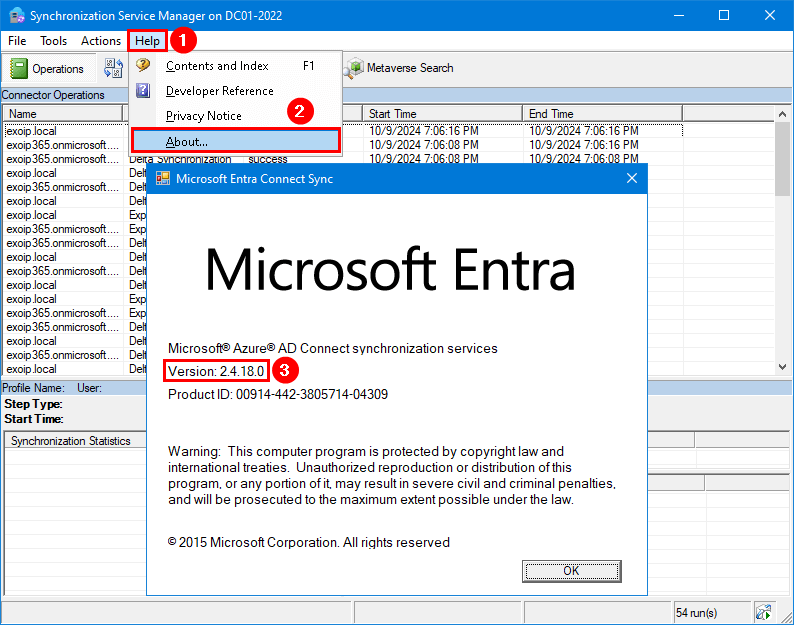 Verifique a versão do Microsoft Entra Connect no Synchronization Service Manager