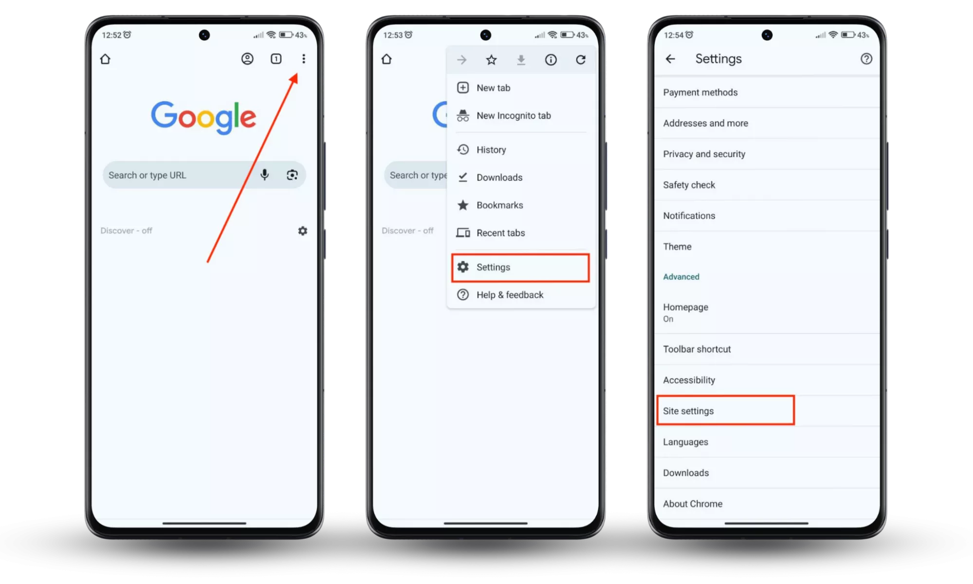 Etapa 1-3. Chrome> menu de três pontos> Configurações, role para baixo e clique em Configurações do site.