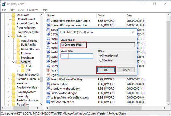 2.Defina o valor NoConnectedUser como “1" se você deseja apenas impedir que os usuários mudem para uma conta da Microsoft. Ou defina-o como "3”Se você deseja impedir que usuários adicionem ou façam logon com uma conta da Microsoft.