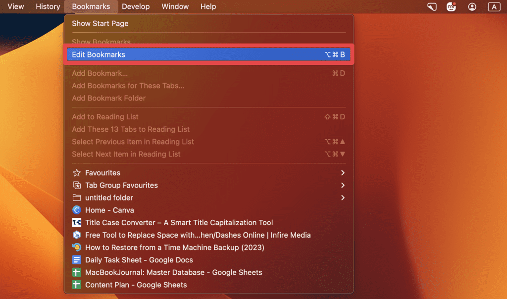 - CliqueMarcadoresna barra de menu e selecioneEditar favoritos.