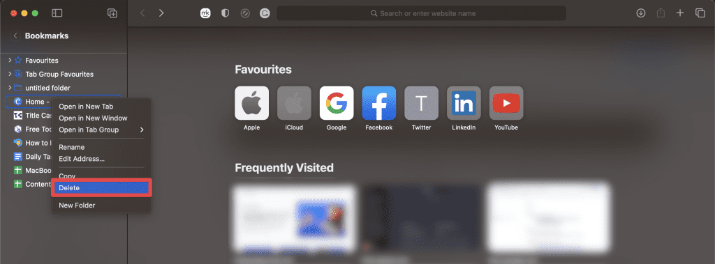 Para remover vários favoritos de uma vez no seu Mac, mantenha pressionado oComando ⌘enquanto clica nos favoritos que deseja excluir e pressione o botãoExcluirchave.