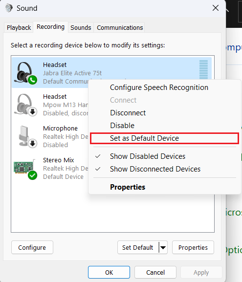 - Sob oGravaçãoguia, você pode testar seu microfone para ver se ele capta algum áudio do seu lado. Se funcionar, você deve verificarDefinir como dispositivo padrãono entanto, se isso não acontecer, talvez você precise investir em um novo microfone.