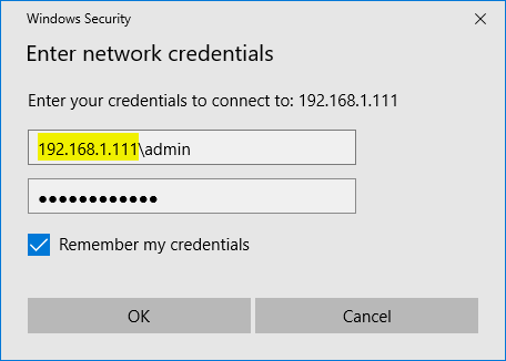- Quando a caixa de diálogo Segurança do Windows aparecer, digite o nome de usuário e a senha do computador que está compartilhando a pasta que você deseja mapear.Observação:Se você continuar recebendo a mensagem de erro “nome de usuário ou senha incorretos“, tente fornecer o nome de usuário como “endereço_ip\nome de usuário“.