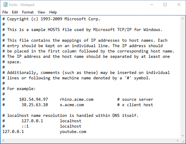 O arquivo hosts pode ser usado para bloquear o acesso a sites que você não deseja visitar. Por exemplo, digamos que você queira impedir que seu computador acesse o site youtube.com, basta adicionar a seguinte linha ao final do arquivo hosts:
