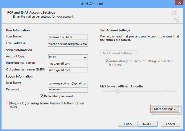 Etapa 5: preencha as informações da sua conta do Gmail e clique emMais configurações.