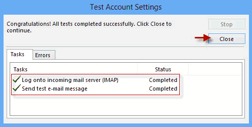 Etapa 9: O Outlook testará as configurações da conta que você inseriu. Se tudo correr bem, ele fará logon no servidor e enviará mensagens de e-mail de teste. Então cliqueFechar.