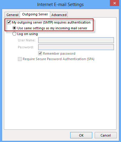 Etapa 6: Selecione a guia “Servidor de saída”, marqueMeu servidor de saída (SMTP) requer autenticaçãoe mantenhaUse as mesmas configurações do meu servidor de e-mail de entradaselecionado.
