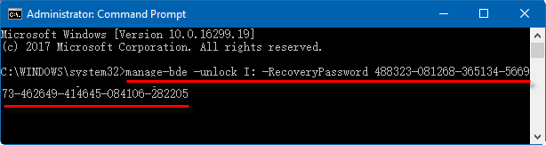 Passo 2: Digite o seguinte comando para desbloquear sua unidade BitLocker com uma chave de recuperação de 48 dígitos:
