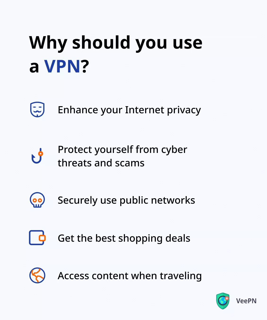Agora que você sabe como usar uma VPN em diferentes dispositivos e sistemas operacionais, vamos discutir exatamente o que você obterá com esta solução. Aqui estão os principais recursos VPN dos quais você pode se beneficiar com uma assinatura da VeePN.