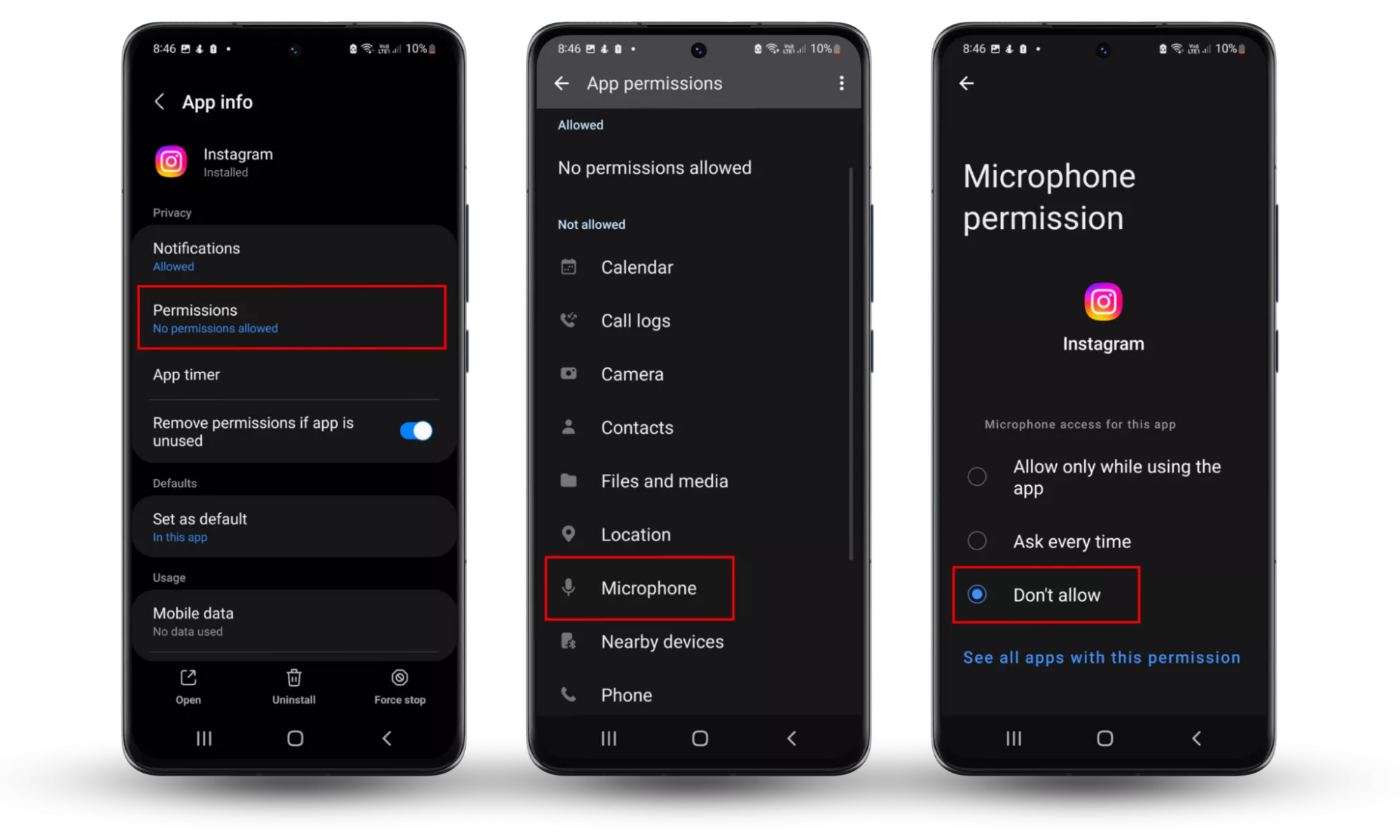 Etapas 1 a 3: Abra o aplicativo Configurações, selecione Privacidade e segurança > Microfone e desative o acesso ao microfone do Instagram.Ou: