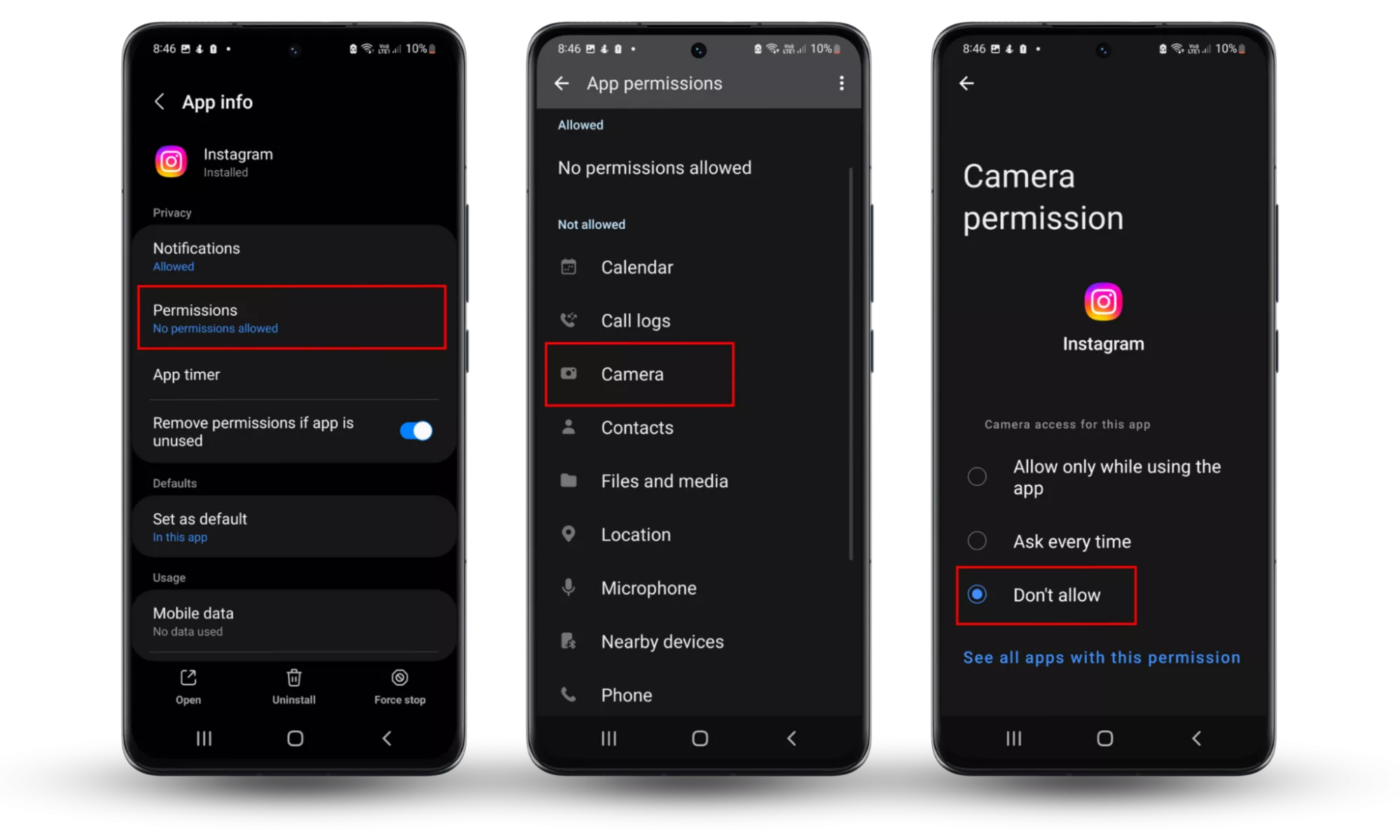 Etapas 1 a 3: Abra o aplicativo Configurações, selecione Privacidade e segurança > Câmera e desative o acesso ao microfone do Instagram.Ou: