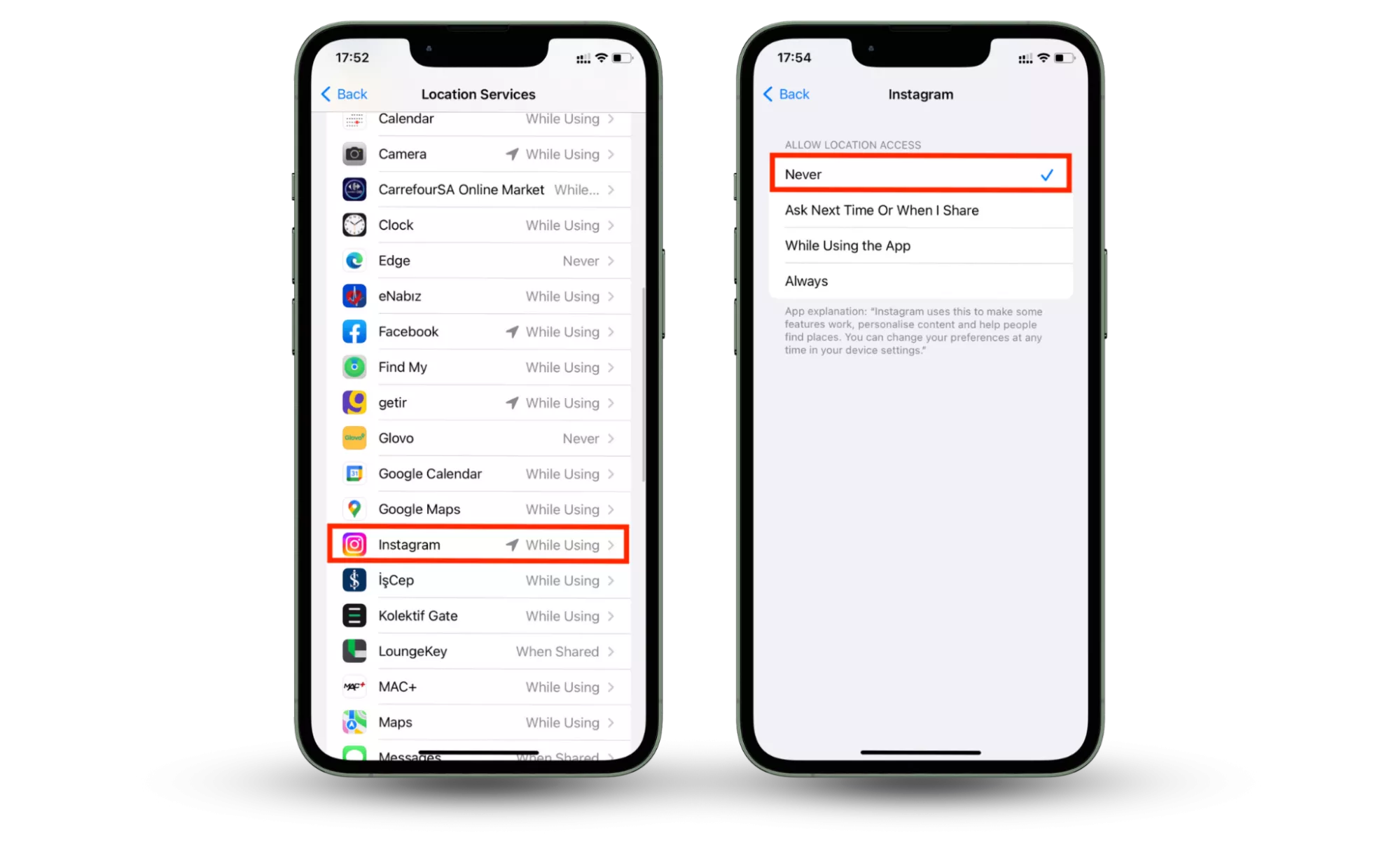 Etapas 3-4: Selecione Instagram > Nunca.Você também pode desativar os serviços de localização em seu telefone como um todo se quiser ter certeza absoluta de que nenhum aplicativo está rastreando seus movimentos.