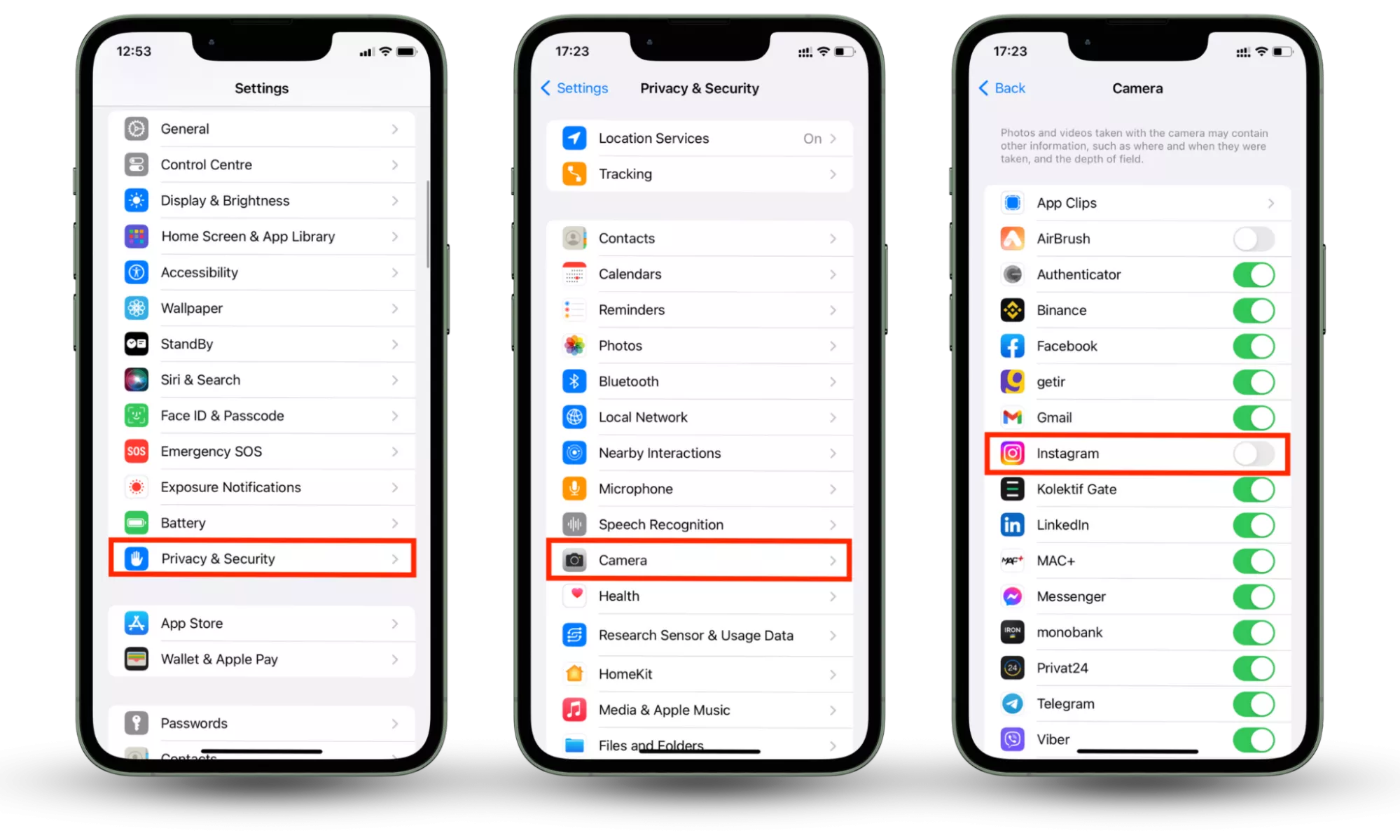 - EscolherCâmeraem seguida, desative o consentimento para Instagram.