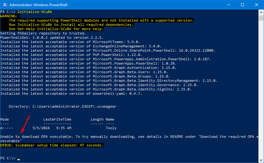 Initialize-SCuBAVocê pode obter o erro abaixo no final: