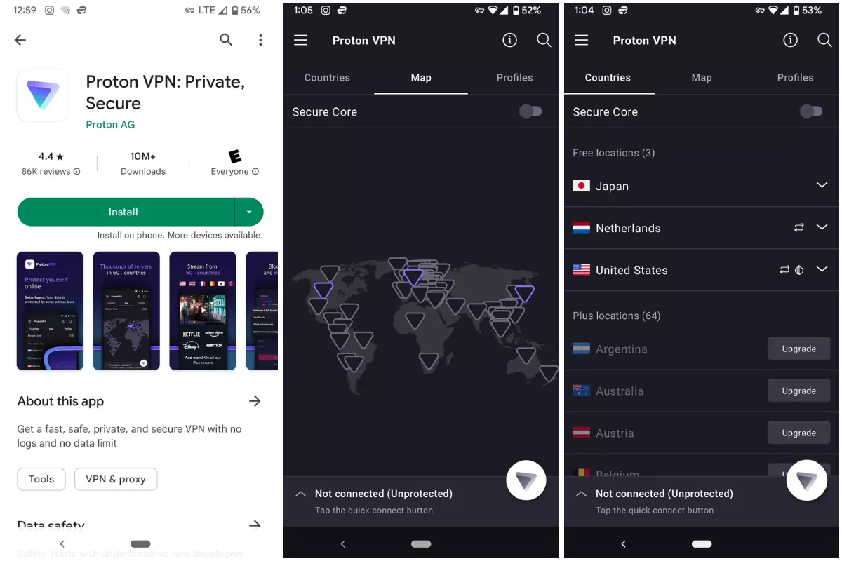 Proton VPN é uma VPN Android gratuita que oferece soluções pagas para acesso e recursos atualizados ao servidor.