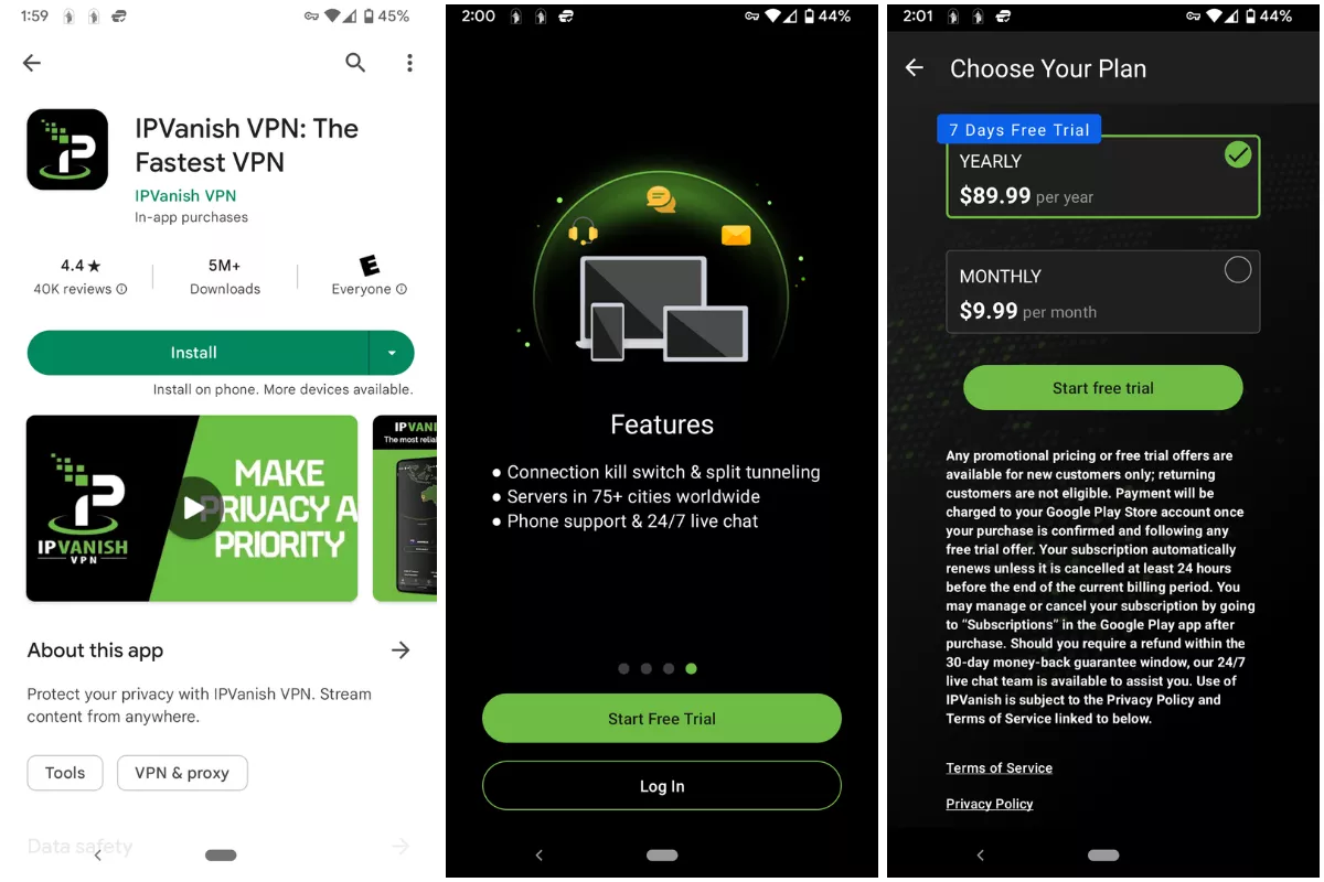 Quando você se inscreve no Google Play, o IPVanish oferece um teste gratuito de 7 dias com seu plano de pagamento anual. As duas opções de pagamento no Google Play incluem: