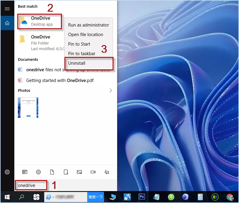 Etapa 1: na barra de pesquisa, digiteonedriveeclique com o botão direitono OneDrive. Então cliqueDesinstalarpara remover o aplicativo OneDrive do Windows.