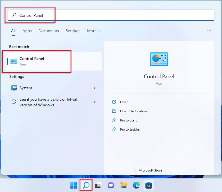 Etapa 3:EscolherProcurarícone na barra de tarefas, insira “Painel de Controle” e selecione Abrir.