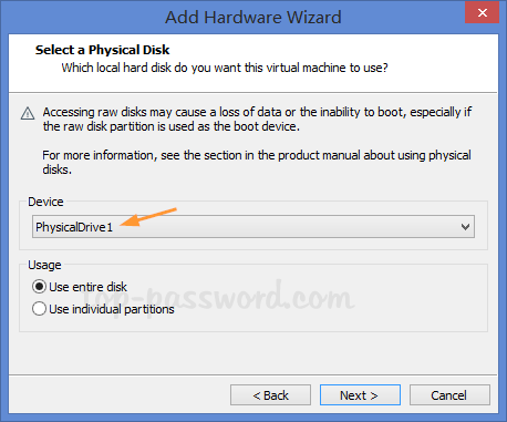 - EscolherUse um disco físico (para usuários avançados)e depois cliquePróximo.