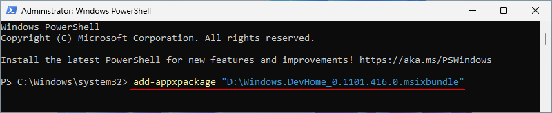 Etapa 3:Tipoadd-appxpackage "D: Windows.DevHome_0.1101.416.0.msixbundle"