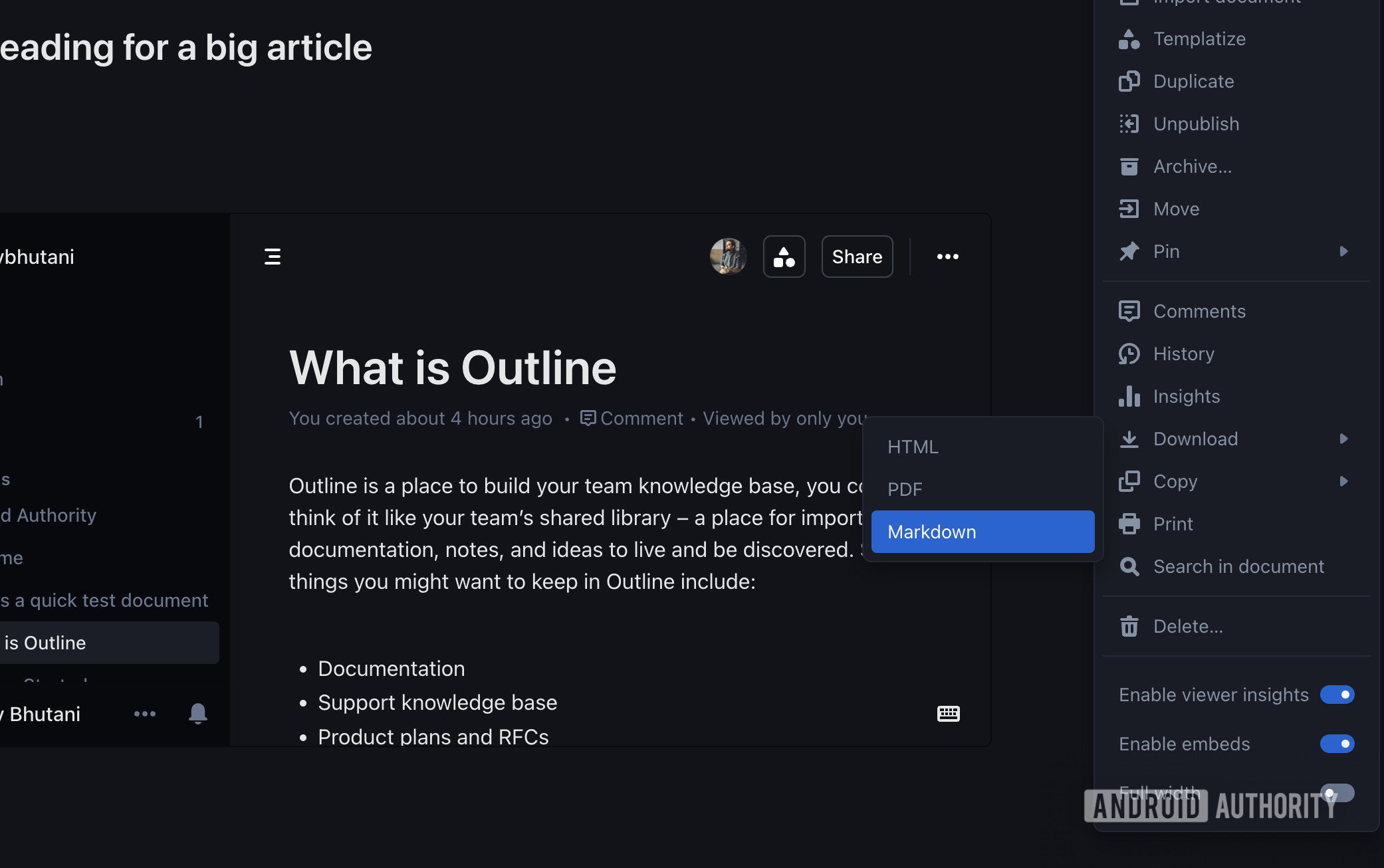 Por falar nisso, o Outline tem mais um recurso que me atrai. A propriedade de dados não é nada sem a facilidade de transferência de dados. Os aplicativos de código aberto também podem interromper o desenvolvimento. Se você tentou exportar documentos do Google Keep ou OneNote, sabe como isso pode ser complicado. As opções de exportação são limitadas e a estrutura do documento é complicada por design, dificultando a transferência desses documentos para outro aplicativo.