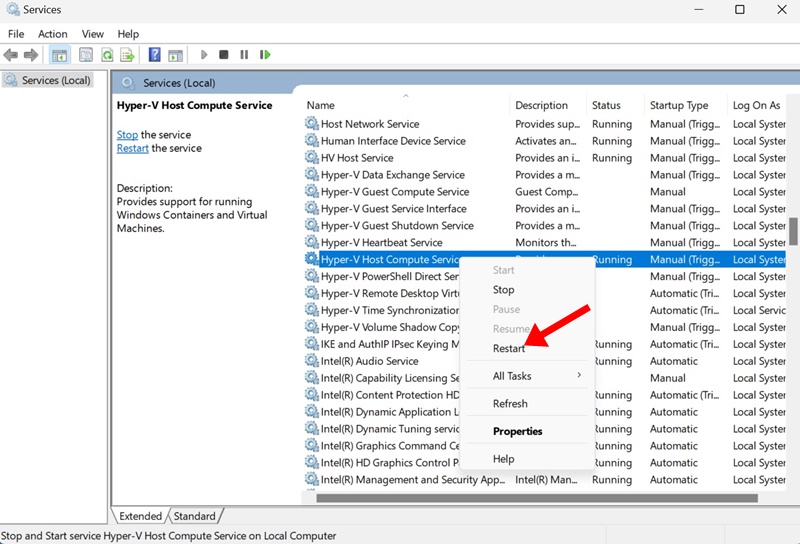 3. Clique com o botão direito em cada serviço Hyper-V e selecioneReiniciar.