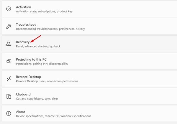 3. No lado direito, clique emRecuperação.