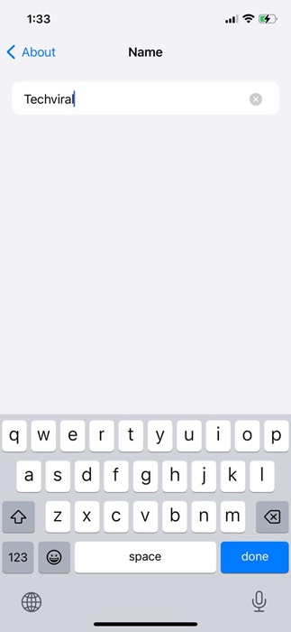 5. Simplesmentedigite o nome que deseja atribuirpara o seu iPhone. Quando terminar, toque no botão Concluído no teclado.