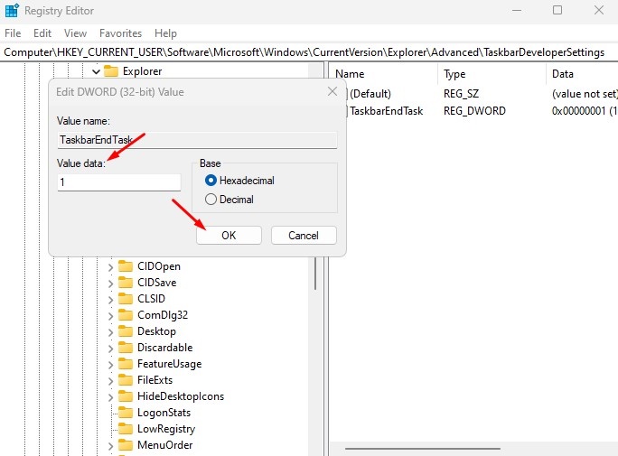 Se você se sentir confortável com a edição do Registro, poderá ativar a opção Finalizar Tarefa na barra de tarefas do Windows 11 modificando o valor da chave TaskbarEndTask. Aqui está o que você precisa fazer.