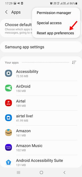 4. Toque noRedefinir preferências do aplicativoopção.