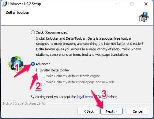 - SelecioneAvançadomodo de instalação e desmarque a opçãoInstale a barra de ferramentas Deltaopção.