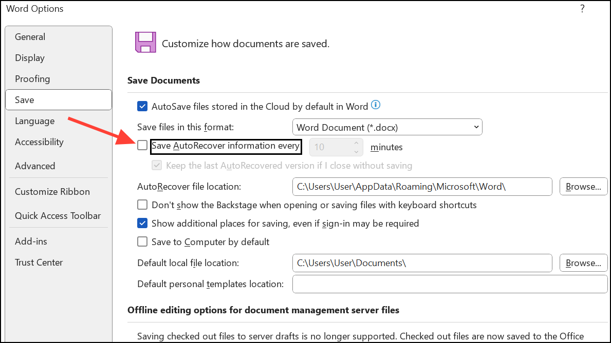 Etapa 1:Desative o salvamento rápido e a recuperação automática navegando paraFile > Options > Savee desmarcandoAllow Fast SaveeSave AutoRecover information every X minutes.