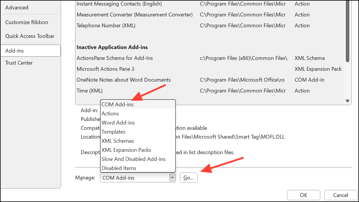 Etapa 2:Se o desempenho melhorar, desative os suplementos um por um viaFile > Options > Add-Inse use o botão “Ir” na parte inferior da caixa de diálogo para gerenciar suplementos COM.